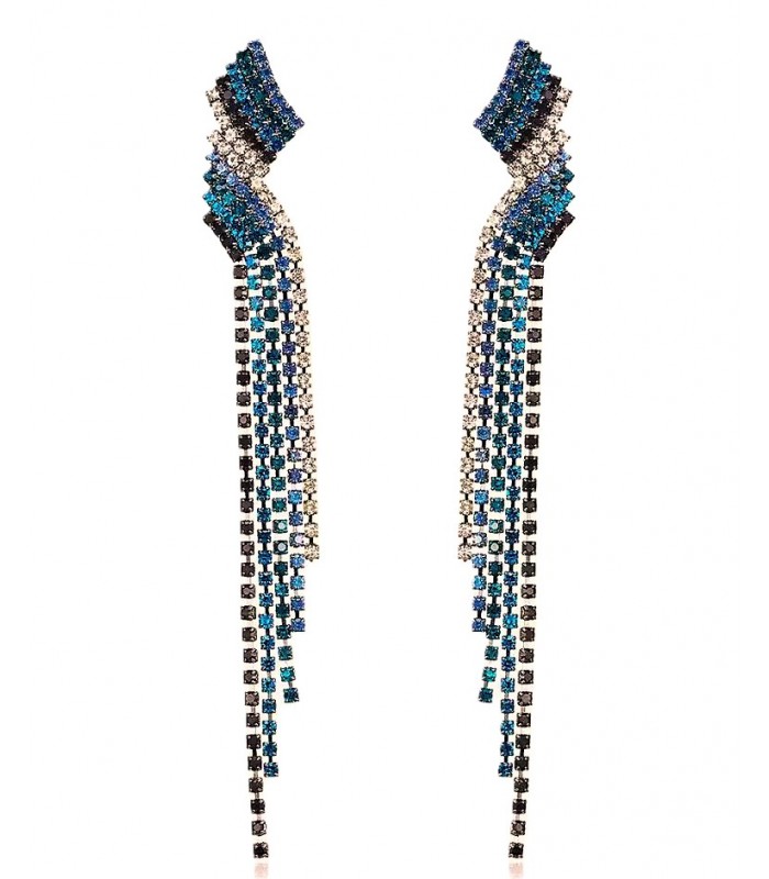 Stunning chandelier dangle earrings feature vibrant rhinestones in a head-turning design. Perfect for weddings, galas, and special occasions. Make a striking, art deco inspired statement with these ravishing, clear, black & navy blue rhinestone long dangle earrings. Accented by a geometric fringe design with shimmering rhinestone accents adding alluring movement to any look.